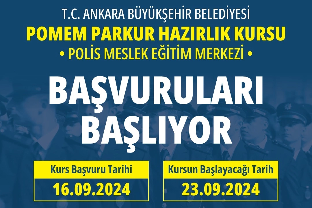 Ankara Büyükşehir Belediyesi, POMEM (Polis Meslek Eğitim Merkezi) sınavına hazırlanan adaylara yönelik başlattığı ücretsiz hazırlık parkur kursları devam ediyor. Adaylar, 16 Eylül Pazartesi günü “www.ankara.bel.tr” adresi üzerinden başvuru yapabilecek. POMEM parkur hazırlık kursu ise 23 Eylül 2024 tarihinde başlayacak.