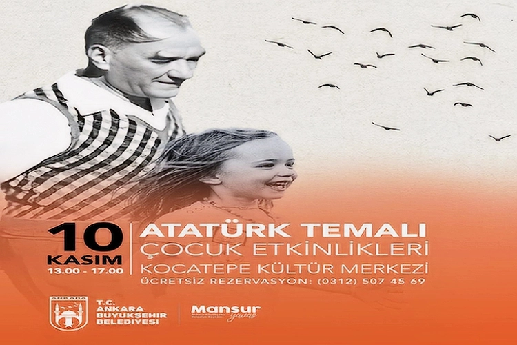 Atatürk’ün hayatını, fikirlerini ve Cumhuriyet’in kuruluş sürecini anlatan program kapsamında; 10 Kasım Pazartesi günü Kocatepe Kültür Merkezi’nde 13.00-17.00 saatleri arasında çocuklara yönelik “Atatürk Temalı Çocuk Atölyeleri” gerçekleştirilecek. Aynı gün saat 20.00’de ise “Son 11 Ay” isimli lirik anlatı sahnelenecek.