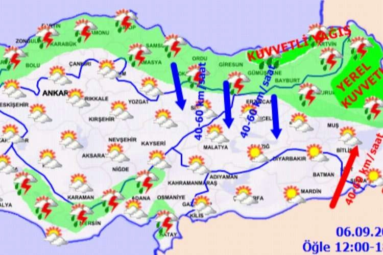 RÜZGAR: Genellikle kuzeyli, Akdeniz kıyıları ile güneydoğu kesimlerde güneyli yönlerden hafif, ara sıra orta kuvvette, Marmara'nın batısı ile Kıyı Ege'de kuzeyli yönlerden, Orta Karadeniz'in iç kesimleri ile Doğu Anadolu'nun güneydoğusunda kuvvetli (40-60 km/sa) esmesi bekleniyor.