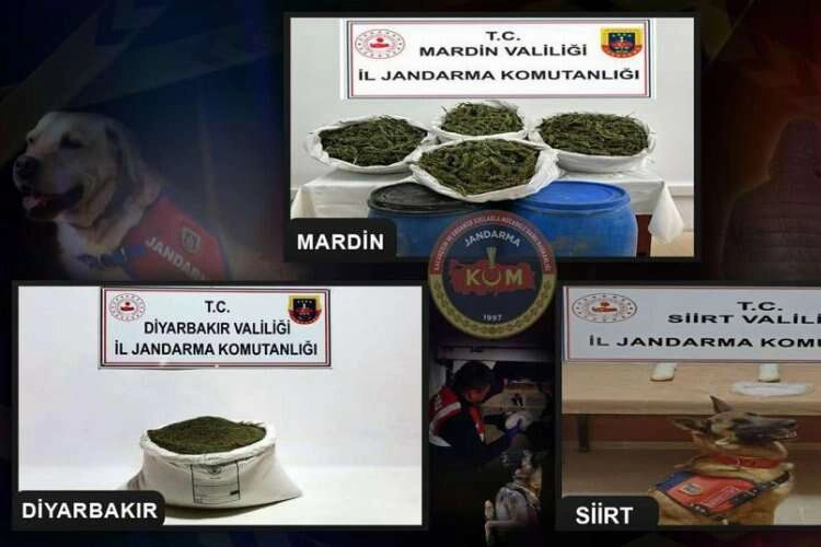 Diyarbakır Ajans / DİYARBAKIR (İGFA) - Jandarma Genel Komutanlığı'ndan alınan bilgiye göre, 12,13 ve 19 Nisan tarihleri arasında Jandarma Komutanlığı ekiplerince Diyarbakır, Mardin ve Siirt illerinden yapılan operasyonlarda 25 kilogram toz esrar ile 28 kilo 500 gram kubar esrar, 1 kilo 600 gram metamfetamin uyuşturucu maddeleri ele geçirildiği bildirildi.