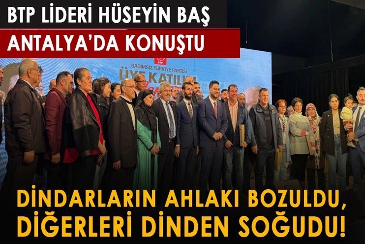 Bağımsız Türkiye Partisi (BTP) Genel Başkanı Hüseyin Baş, partisinin Antalya’da düzenlenen yeni üye katılım şöleni programına katıldı. BTP lideri Baş, yoğun katılımın olduğu programda partiye yeni katılan vatandaşlara rozetlerini taktı. Sevilen sanatçı Ahmet Selçuk İlkan’ın şiir dinletisinin de yer aldığı programda konuşan Hüseyin Baş, gündeme dair dikkat çekici açıklamalarda bulundu.