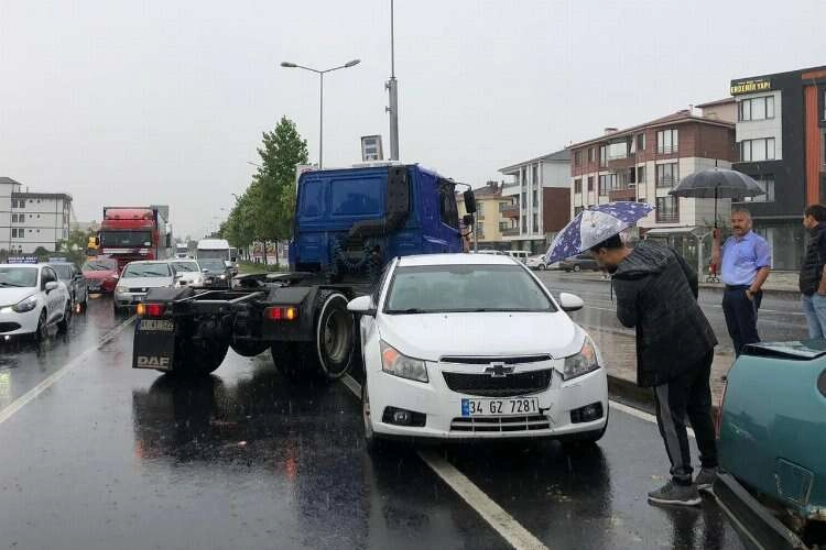 Sefer DEMİR / DÜZCE (İGFA)- Alınan bilgiye göre Bahçeşehir bağlantı yolunda metek ışıklı kavşağı mevkisinde direksiyon hakimiyetini kaybeden M.T.U idaresindeki 81 AT 522 plakalı tır aracı ışıklarda bekleyen M.İ yönetimindeki 81 FJ 659 plakalı ve K.K'nın sürücülüğü yaptığı 34 GZ 7281 plakalı otomobillere çarptı.