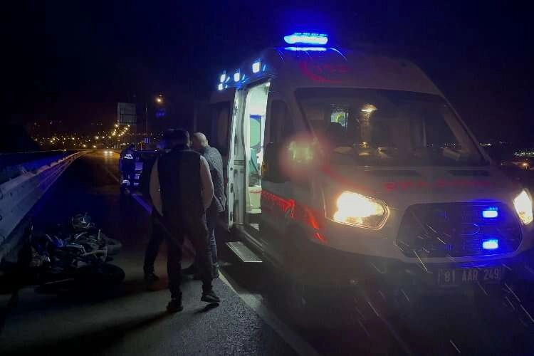 Sefer DEMİR / DÜZCE (İGFA) - Alınan bilgiye göre Kuzey Çevre Yolu Tokuşlar mevkiinde Bahçeşehir istikametine seyir halinde olan N.E idaresindeki 81 ACA 279 plakalı otomobil, aynı yöne gitmekte olan D.Ç yönetimindeki 81 ACM 482 plakalı motosiklete çarptı.