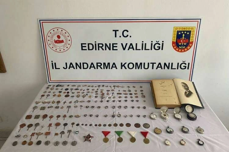 Erdoğan DEMİR / EDİRNE (İGFA) - Edirne İl Jandarma Komutanlığı KOM Şube Müdürlüğü ekiplerince, kaçakçılığın önlenmesine yönelik faaliyet kapsamında; 5 adet Osmanlı dönemine ait madalya, 1 adet Arapça yazılı nutuk kitabı, 10 adet köstekli cep saati, 1 adet barometre, 30 adet Bizans ve Roma dönemine ait yüzük, 133 adet obje ve 10 adet sikke olmak üzere toplam 190 adet tarihi eser ele geçirildi. Olayla ilgili 1 kişi hakkında gerekli yasal işlemler yapıldı.
