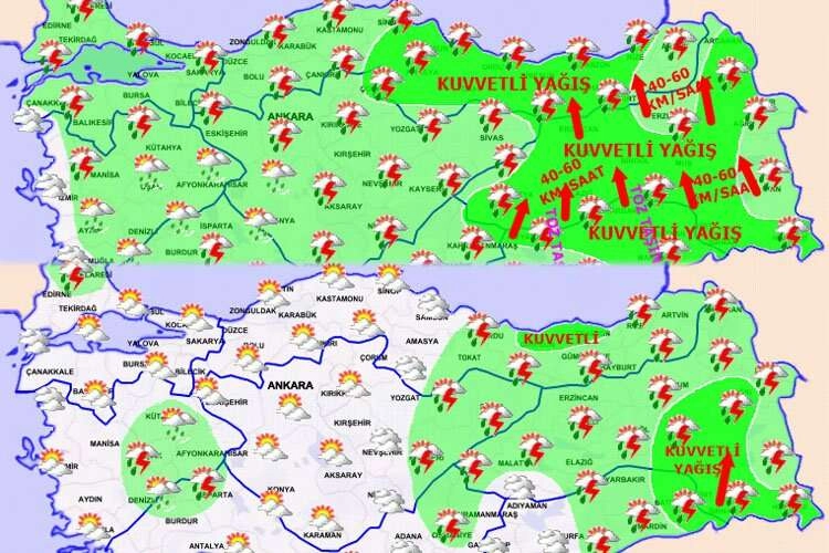 KUVVETLİ YAĞIŞ UYARISI: Yağışların: Orta ve (Artvin hariç) Doğu Karadeniz, (Van ve Iğdır hariç) Doğu Anadolu ile K.Maraş, Adana, Osmaniye, Adıyaman, Diyarbakır, Batman, Mardin ve Siirt çevrelerinde yer yer kuvvetli olması beklendiğinden yaşanabilecek olumsuzluklara karşı dikkatli ve tedbirli olunması gerekmektedir.