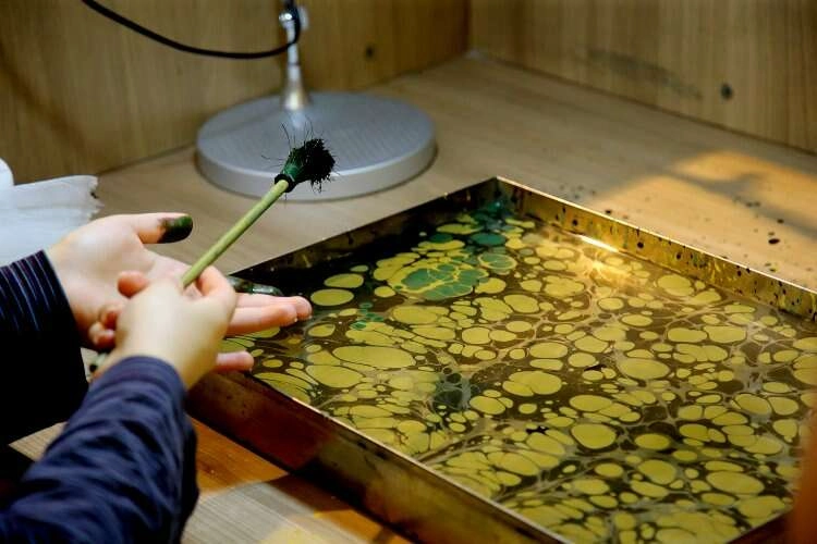 Hünerli ellerin, yeteneklerinin ön plana çıktığı Geleneksel Sanatlar atölyesinde ilk iki hafta çini sanatı işlenirken bu hafta ebru sanatının incelikleri işlendi.