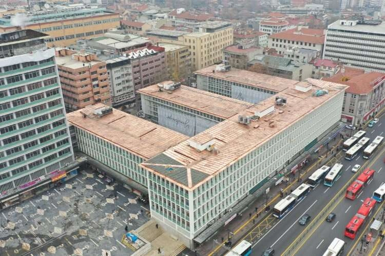 Ulus İş Hanı’nın çatısında gerçekleştirilen çalışmalar kapsamında; sonradan konulan klima elemanları kaldırılırken blokların havalandırılması için ünite sistemi yerleştiriliyor. Kenetli bakır çatı kaplaması özgüne uygun malzeme ve tekniklerle yenileniyor. Yağmur olukları temizlenip, bakımları yapılıyor.