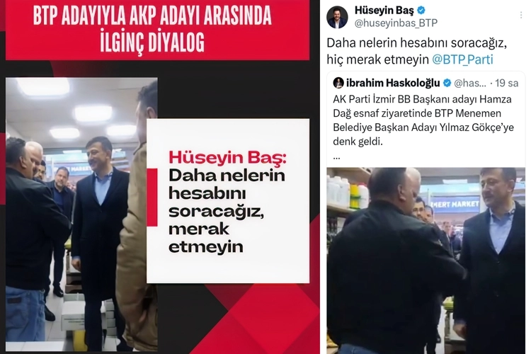 AKP İzmir Büyükşehir Belediye Başkan Adayı Hamza Dağ, girdiği dükkanda Bağımsız Türkiye Partisi (BTP) Menemen Adayı Yılmaz Gökçe ile karşılaşınca ilginç bir diyalog yaşandı. AKP İzmir BB Başkanı adayı Hamza Dağ esnaf ziyaretinde BTP Menemen Belediye Başkan Adayı Yılmaz Gökçe’ye denk geldi.
