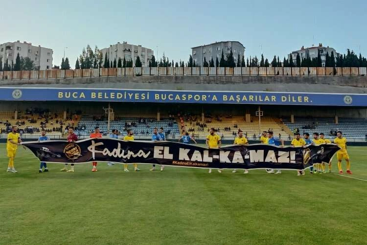 İZMİR (İGFA) - Aile ve Sosyal Hizmetler Bakanlığı ve İçişleri Bakanlığı iş birliğinde yürütülen; Aile içi ve Kadına Yönelik Şiddetle Mücadelenin etkin ve etkili sürdürülebilmesine yönelik farkındalık oluşturmak için, "Kadına El Kalkamaz" sloganı çerçevesinde Bucaspor 1928'li futbolcular, TFF 2. Lig Kırmızı Grup'ta evinde Ankara Demirspor'la karşılaştığı randevu öncesi açtığı pankartla destek verdi.