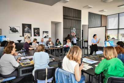 Figen Güneş Doğan (Resim Kursiyeri): "Resim öğrenmeye çalıştı.Pastel ve kuru boya çalışmalarıla başladı.Sonra akrilik çalışmalar yapıldı.Çok faydalı oldu.Benim resim geçmişim çok fazla yoktu.Bir kurs vardım halihazırda ama Belediyenin hiç böyle güzel bir kursu olduğunu biliyordu.Böyle hocaları burada bulabileceğimizi de görebiliyork.Çok güzel.Bina da çok güzel, yüksek tavan,, buraya gelesi geliyor.Böyle bir imkan bize için çok çalışıyoruz."