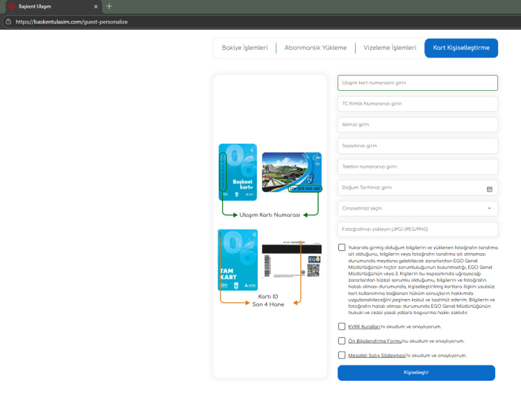 Online kart kişiselleştirme işlemleri, https://baskentulasim.com adresi üzerinden “Kart Kişiselleştirme” sekmesinden gerçekleştirilebiliyor. Uygulama sayesinde anonim kart sahipleri, kartlarını kendilerine özel hâle getirerek hem zaman tasarrufu sağlıyor hem de işlem merkezlerindeki yoğunluğun azaltılmasına katkı sunuyor.