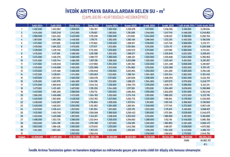 İvedik Arıtma Tesisi’ne gelen ve hanelere dağıtılan su miktarının 2024 ve 2025 yılları arası karşılaştırması ekte bilgilerinize sunulmuştur.