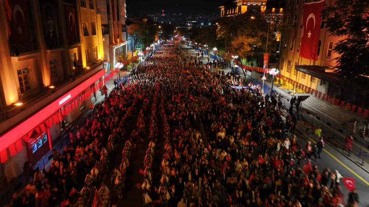 Mareşal Atatürk Anıtı’ndan Birinci Meclis’e kadar meşalelerle yürüyen vatandaşlar, ellerinde Türk bayraklarıyla Cumhuriyet marşlarını hep bir ağızdan söyledi. ABB Başkanı Mansur Yavaş da kortejde yer alarak vatandaşlarla birlikte yürüdü.