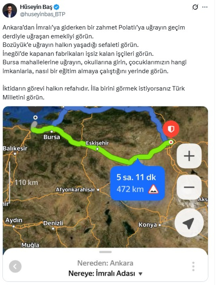 BTP Genel Başkanı Hüseyin Baş’ın sosyal medya hesabından yaptığı paylaşım şöyle;