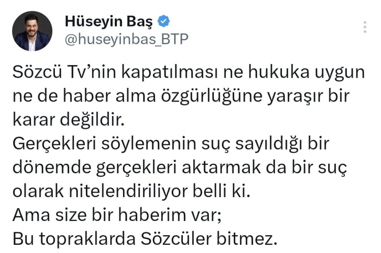 Bağımsız Türkiye Partisi (BTP) Genel Başkanı Hüseyin Baş Sözcü TV’nin yayının kapatılması kararını eleştirdi.