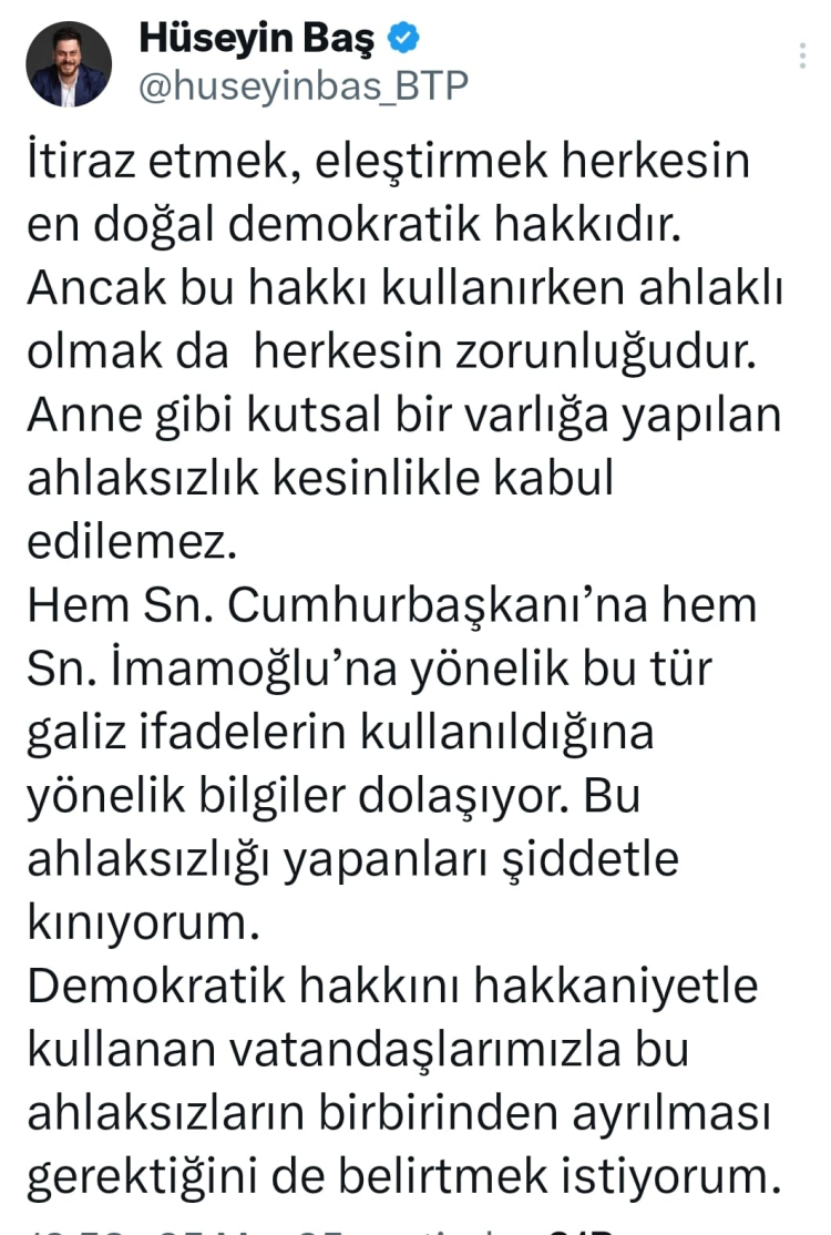 BTP Genel Başkanı Hüseyin Baş, Cumhurbaşkanı Erdoğan'ın annesi Tenzile Erdoğan ve Ekrem İmamoğlu'nun eşi Dilek İmamoğlu'na yönelik çirkin sözlere tepki gösterdi. Sosyal medyadan 'Bu ahlaksızlığı yapanları kınıyorum' açıklaması yaptı.