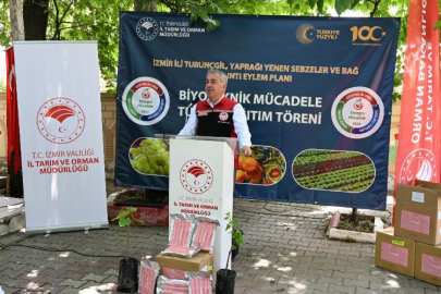 İZMİR (İGFA) - arım ve Orman Bakanlığı tarafından 2024- 2026 yılları arasında Bağda Kalıntı Önleme projesi kapsamında İzmir İl Tarım ve Orman Müdürlüğü tarafından projelendirilen ve Bakanlık tarafından bütçesi sağlanan bağda ana zararlı olan Salkım Güvesine (Lobesia Botrana) karşı; Menderes İlçesi Yeniköy Mahallesinde bağ üretim alanlarının tamamında kullanılmak üzere 55 üreticiye, 555 da alan için 33.500 adet biyoteknik mücadele feromon dağıtımı gerçekleştirildi.