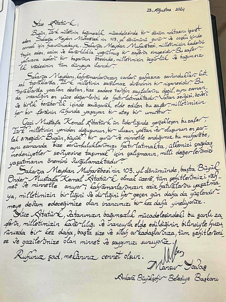 Sakarya Meydan Muharebesi’nin 103. yıl dönümünde, başta Büyük Önder Mustafa Kemal Atatürk olmak üzere, tüm şehitlerimizi rahmet ve minnetle anıyor; kahramanlarımızın aziz hatıralarını yaşatmaya, milletimizin birliğini ve dirliğini her geçen gün daha da güçlendirmeye devam edeceğimize olan inancımızı bir kez daha yineliyoruz. Yüce Atatürk, vatanımızın bağımsızlık mücadelesindeki bu şanlı zaferin, milletimizin kararlılığı ve inancıyla elde edildiğinin bilinciyle huzurunuzda bir kez daha, başta size ve silah arkadaşlarınıza, tüm şehitlerimize ve gazilerimize olan minnet ve saygımızı sunuyoruz. Ruhunuz şad, mekânınız cennet olsun.”