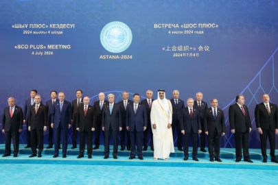 Kazakistan Cumhurbaşkanı Kasım Cömert Tokayev'in ev sahipliğinde "ŞİÖ +" formatında Bağımsızlık Sarayı'nda düzenlenen zirve öncesinde liderler, aile fotoğrafı için bir araya geldi.