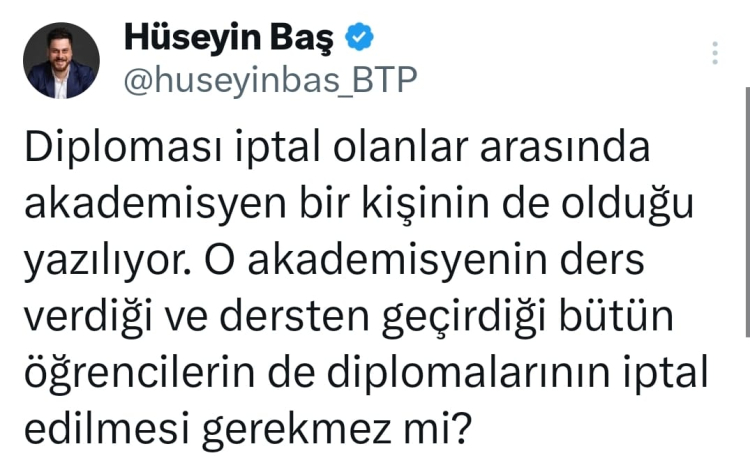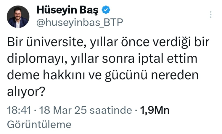 BTP lideri Hüseyin Baş, Ekrem İmamoğlu’nun üniversite diplomasının iptal edilmesine ilişkinde de paylaşımlar yaptı.