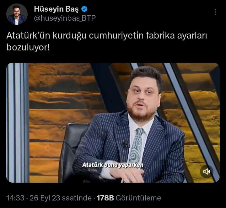 Sosyal medya hesabından “Atatürk’ün kurduğu cumhuriyetin fabrika ayarları bozuluyor” başlığıyla bir video yayınlayan Hüseyin Baş söz konusu videoda, “Atatürk nüfus mübadelesi yaparak Anadolu’yu Türklerle doldurdu, bunlar kendi mübadelelerini yaparak Anadolu’yu yabancılarla dolduruyorlar” dedi.