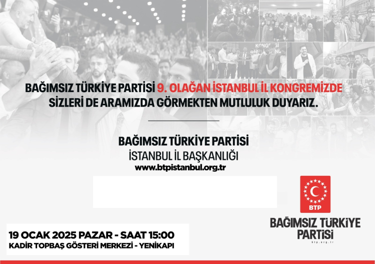 BTP’nin 9. Olağan İstanbul İl Kongresi 19 Ocak Pazar günü gerçekleştirilecek.