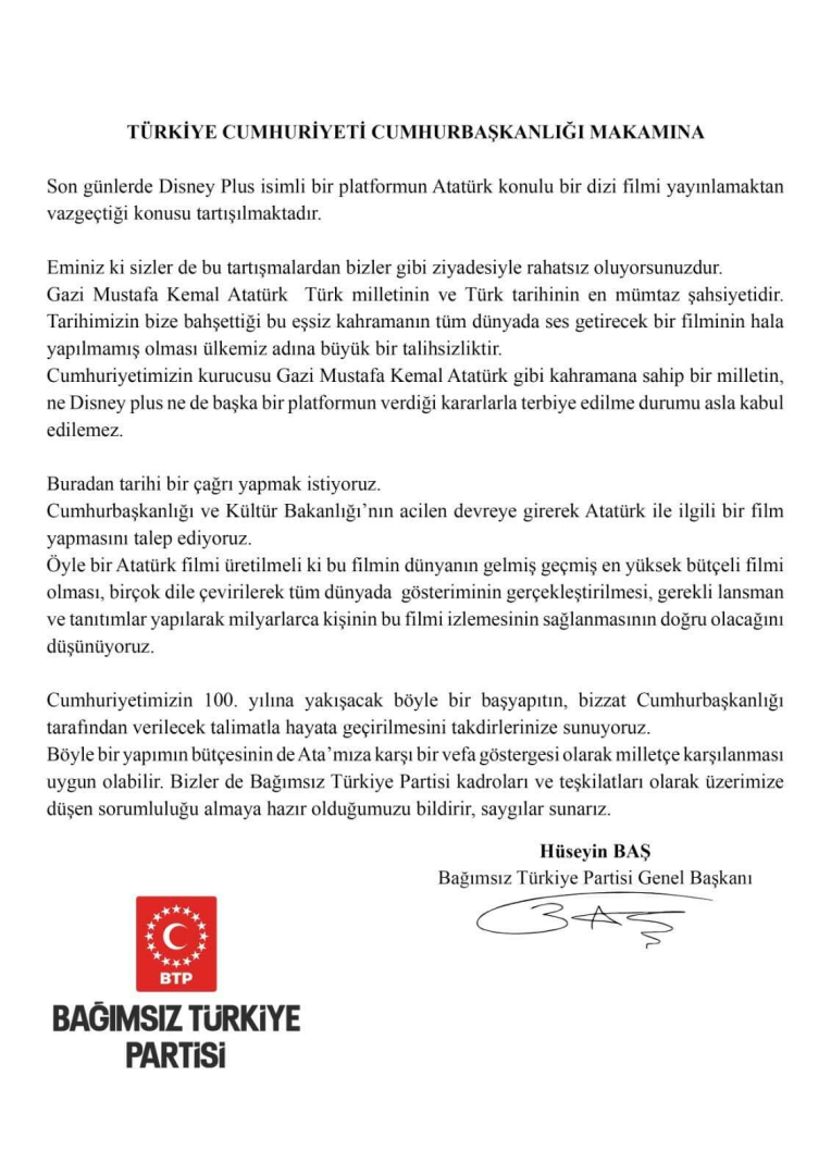 Bağımsız Türkiye Partisi (BTP) Genel Başkanı Hüseyin Baş, Amerikalı Dijital yayın ağı Disney Plus’ın Ermeni lobisinin girişimleri sonucu Atatürk dizisini iptal etmesine tepki gösterdi.