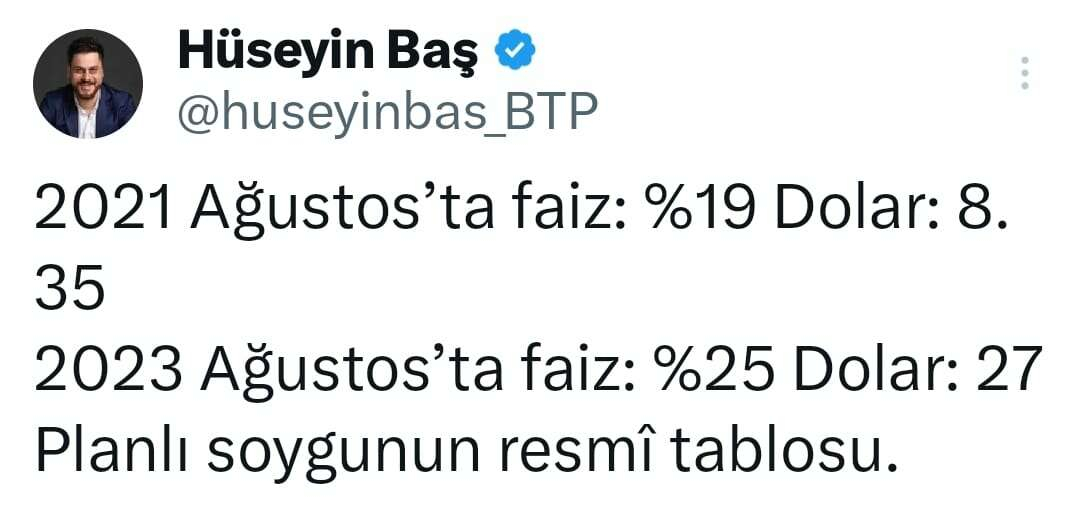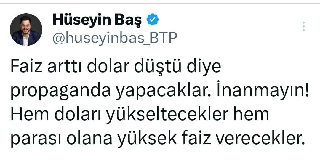 BTP Genel Başkanı Hüseyin Baş, “Faiz arttı dolar düştü diye propaganda yapacaklar. İnanmayın! Hem doları yükseltecekler, hem parası olana yüksek faiz verecekler” dedi.