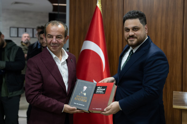 Tanju Özcan, Hüseyin Baş'a Köroğlu plaketi hediye ederken Hüseyin Baş da Tanju Özcan'a Prof. Dr. Haydar Baş'ın Hoş Geldin Atatürk ve Milli Ekonomi Modeli kitaplarını hediye etti.