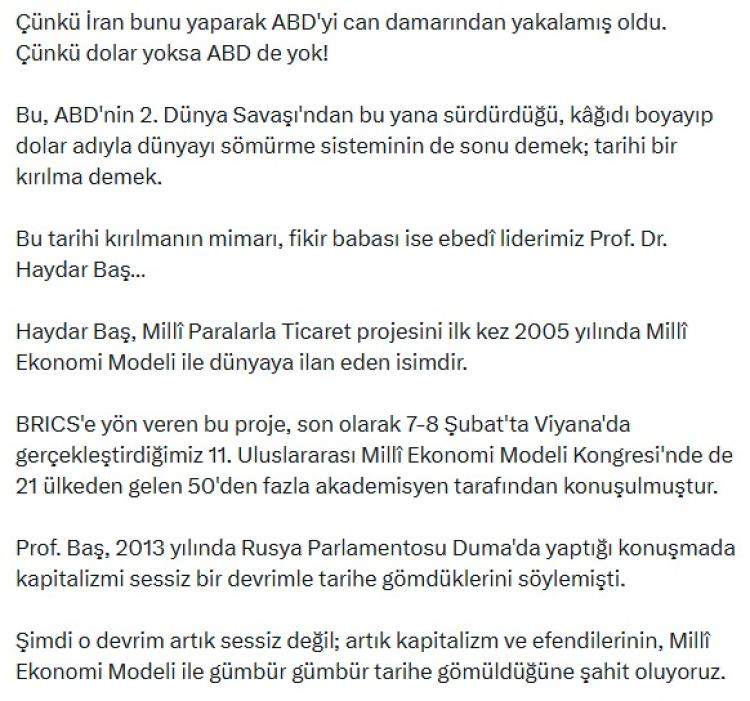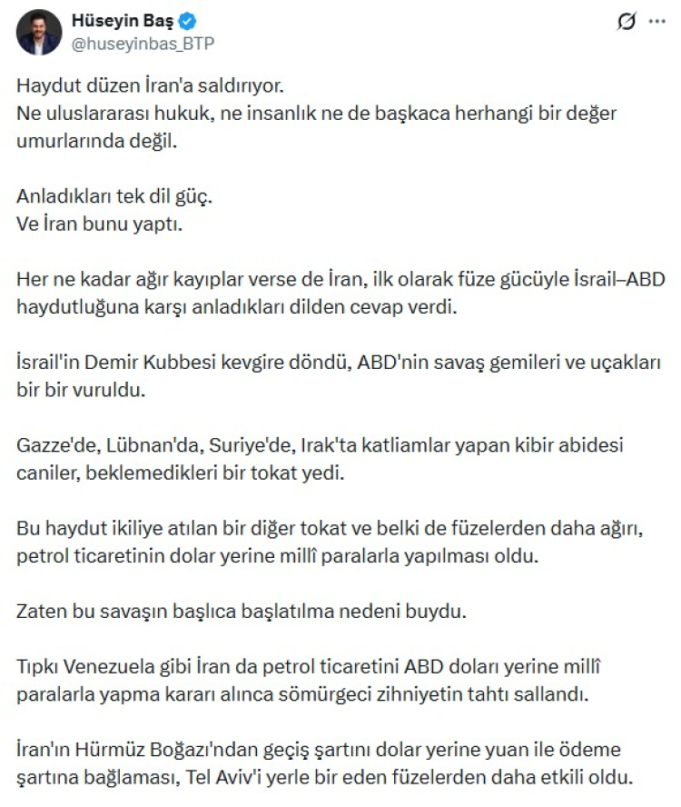 Sosyal medya hesabından açıklama yapan BTP lideri ABD- İsrail ikilisinin İran'a saldırmasının ana nedenlerinden birinin İran'ın petrol ticaretini dolar yerine milli paralarla yapma kararı alması olduğunu ifade etti.