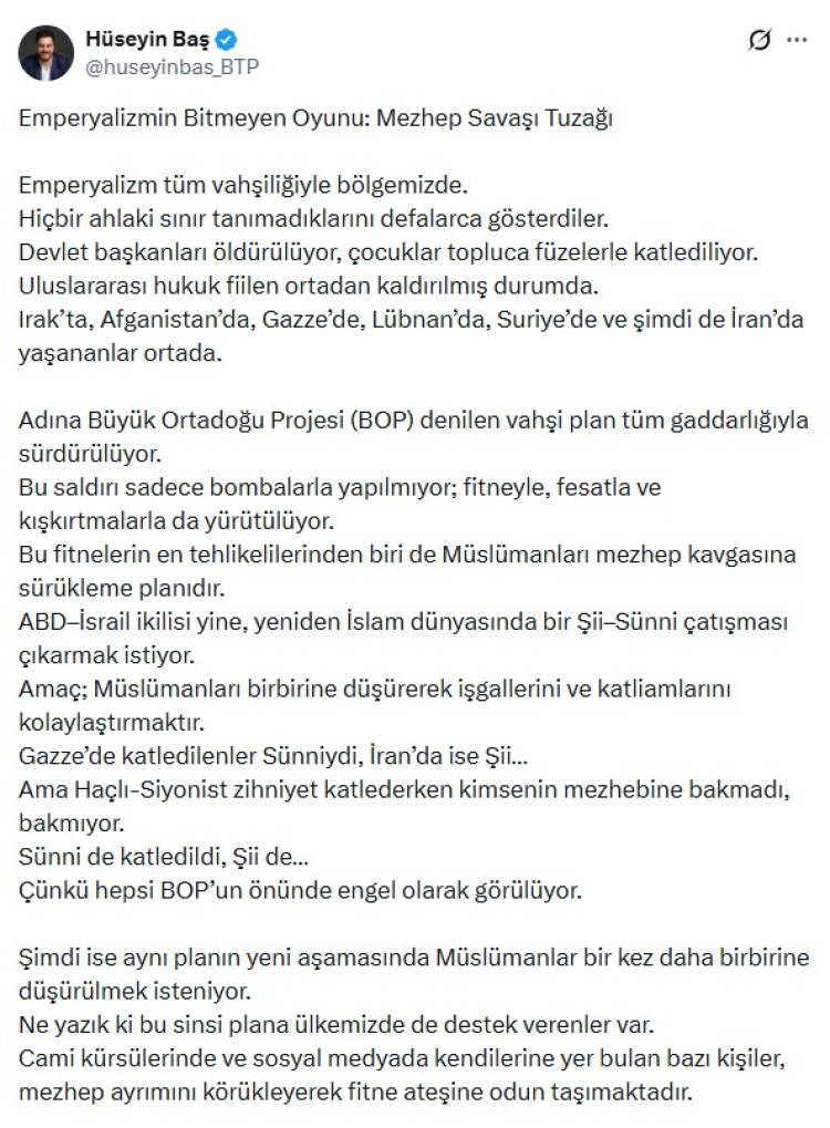 Sosyal medya hesabından "Emperyalizmin Bitmeyen Oyunu: Mezhep Savaşı Tuzağı" başlığı ile bir açıklama yapan Hüseyin Baş, "Cami kürsülerinde ve sosyal medyada kendilerine yer bulan bazı kişiler, mezhep ayrımını körükleyerek fitne ateşine odun taşımaktadır. Çok net olarak şunu söyleyebiliriz: Bu tavır bir ajan faaliyetidir. Bu tavır ABD–İsrail planlarına hizmettir. Bu tavır ülkemizin dini ve milli bütünlüğüne yönelik bir operasyondur." dedi.