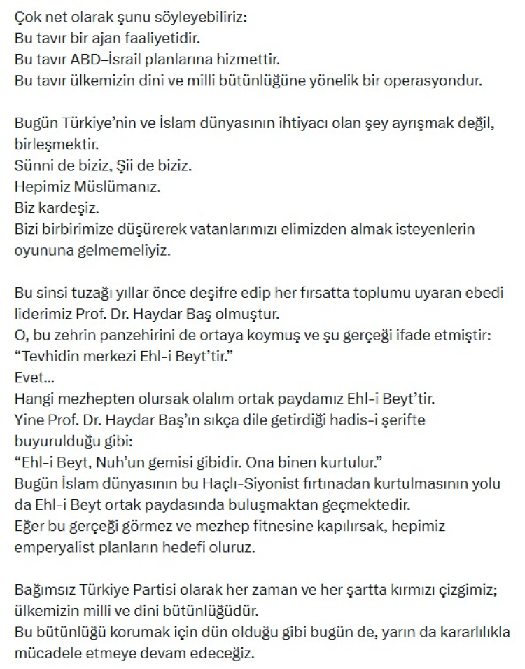 Bugün İslam dünyasının bu Haçlı-Siyonist fırtınadan kurtulmasının yolu da Ehl-i Beyt ortak paydasında buluşmaktan geçmektedir. Eğer bu gerçeği görmez ve mezhep fitnesine kapılırsak, hepimiz emperyalist planların hedefi oluruz. Bağımsız Türkiye Partisi olarak her zaman ve her şartta kırmızı çizgimiz; ülkemizin milli ve dini bütünlüğüdür. Bu bütünlüğü korumak için dün olduğu gibi bugün de, yarın da kararlılıkla mücadele etmeye devam edeceğiz."